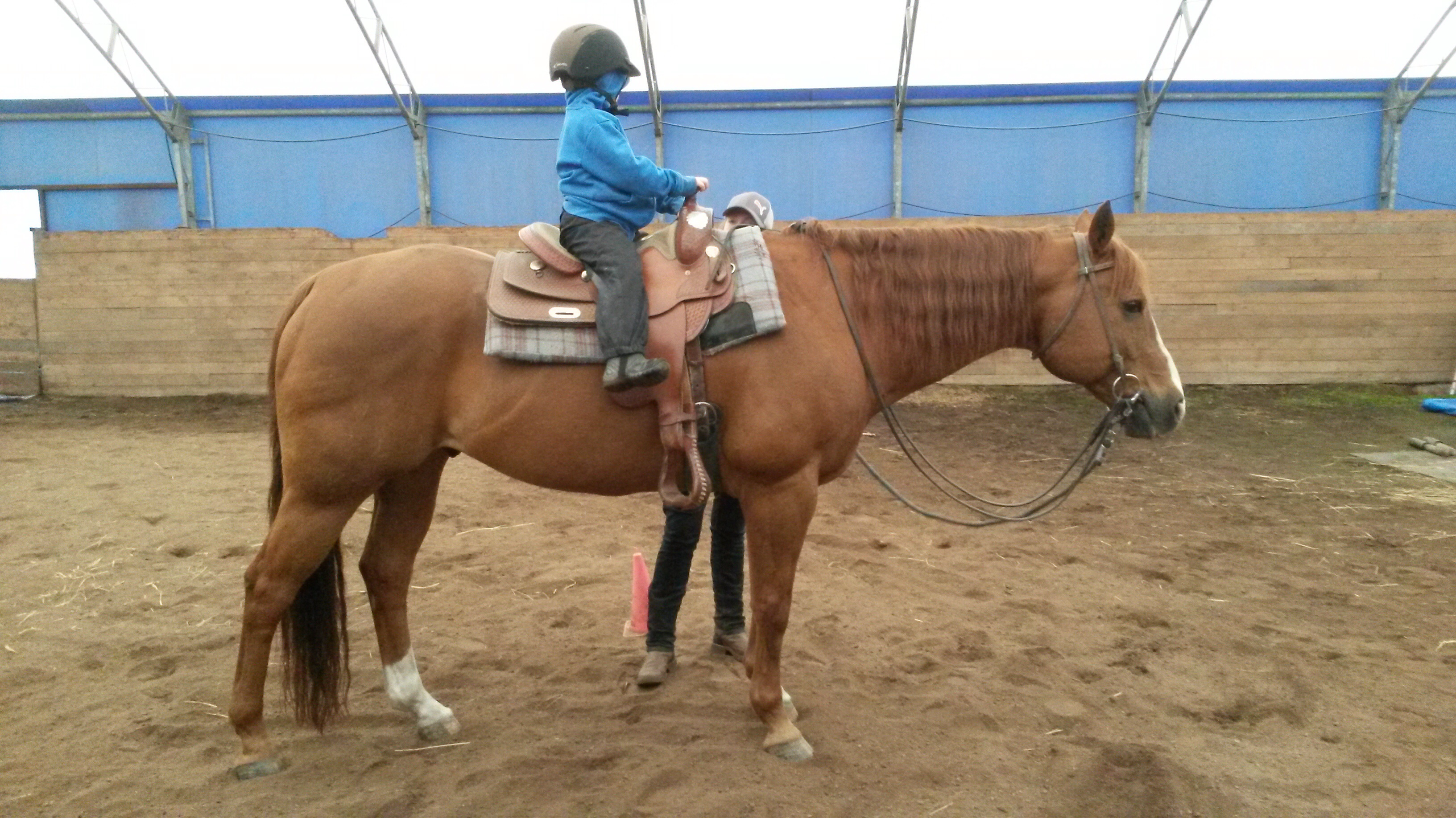 Måndagen blev den bästa dagen hittills! Vår fina vän Jenny bjöd med oss hem till sin moster Kicki som har eget stall och sju hundar… En riktig dröm för Dina. Hon fick borsta, fläta, mata, fixa och självklart rida! Först på ponnyn Zorro och sen på cowboyhästen Red.