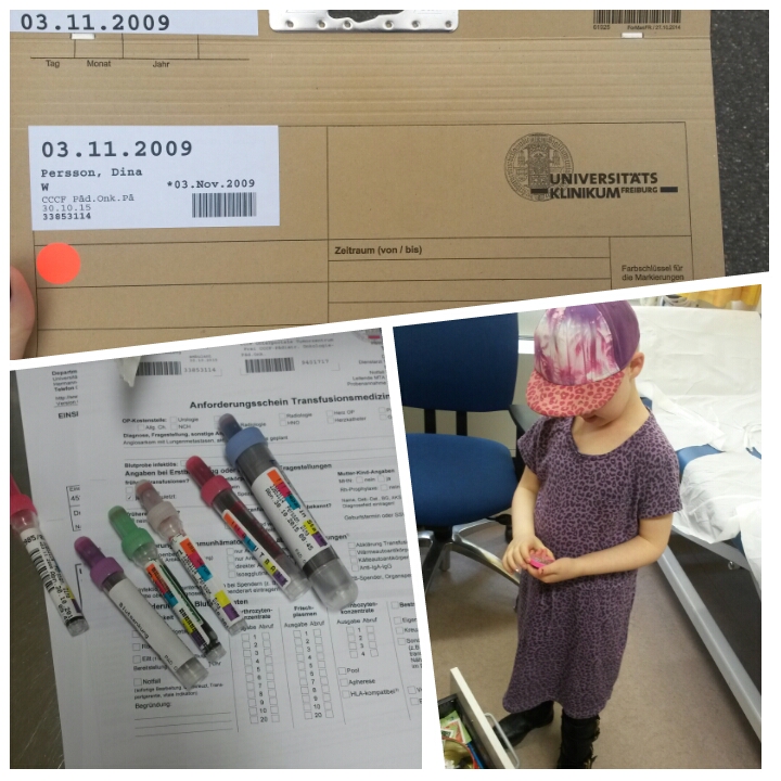 Vi kom på kvällen fram till hotellet och åt en sen middag innan vi slocknade i sängen. På fredagsmorgonen tog vi en promenad till sjukhuset där vi var väntade. Allt gick verkligen jättebra, de var vänliga och förberedda. Självklart såg många rutiner annorlunda ut mot vad vi är vana vid, men det funkade för dem. En sköterska var först inne för de grundläggande kontrollerna: blodtryck, vikt, längd och topsning för multiresistenta bakterier från fem olika delar av Dinas kropp. Sen fick vi träffa en av onkologerna som gjorde en andra undersökning, lyssnade på lungor, kollade i svalg och öron, kände på körtlar, klämde på magen och allt annat som Dina är så van vid att hon knappt reagerar på det. Samma onkolog var också den som satte nålen i hennes port. Dina sparkade först bakut, börjar storgråta och håller händerna stenhårt över porten. Jag och Anders försöker resonera med henne medan läkaren lugnt väntar bredvid. Vi prövar med det mesta som vi alltid gör, men vad tror ni funkade? Jo det hederliga gamla godismutandet. Det har inte funkat förut, i just denna situation, men just denna gång så gick det och i ett huj var nålen på plats och de kunde ta alla sina prover. Det blev många rör och innan Dina visste ordet av hade läkaren dragit ut nålen igen.